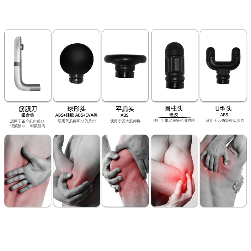 2. 標(biāo)準(zhǔn)配置:主機(jī)+筋膜刀+4種模頭+充電線+包裝