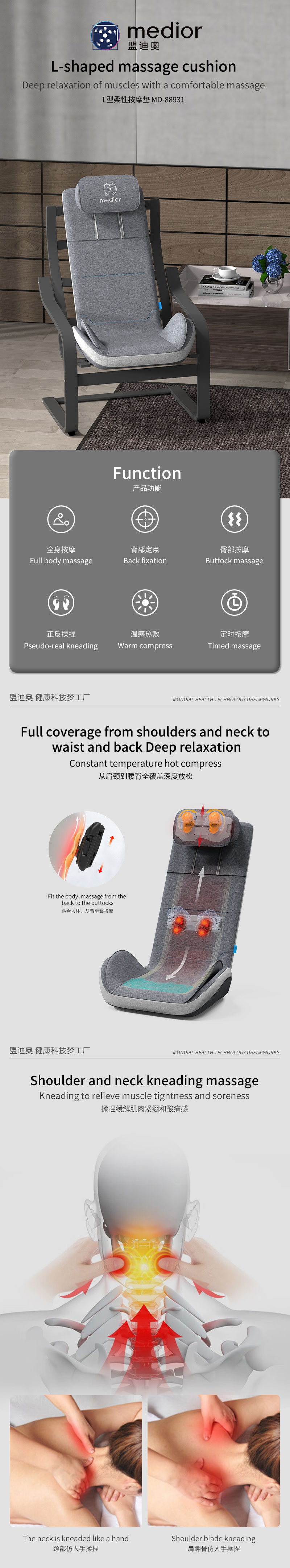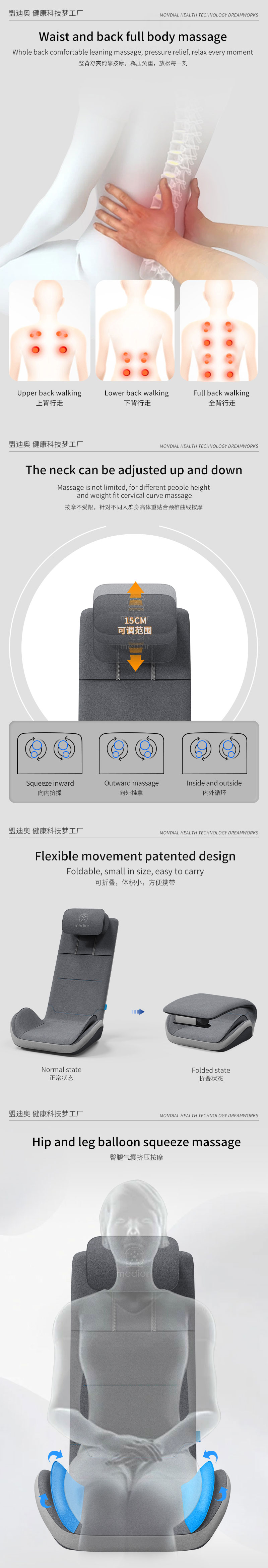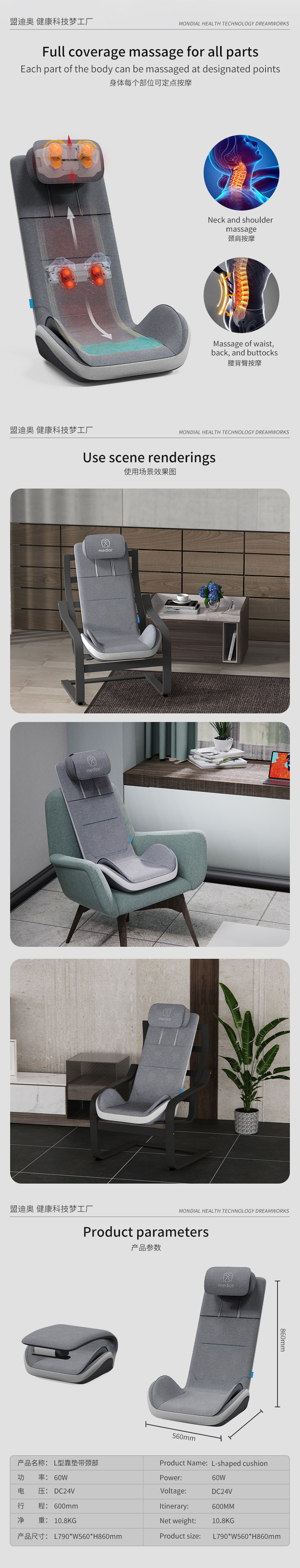 3、力度三檔調(diào)節(jié),定點(diǎn)按摩,腰背按摩、臀腿按摩、全背按摩模式選擇
