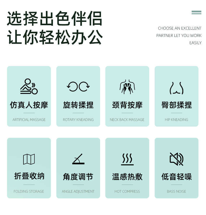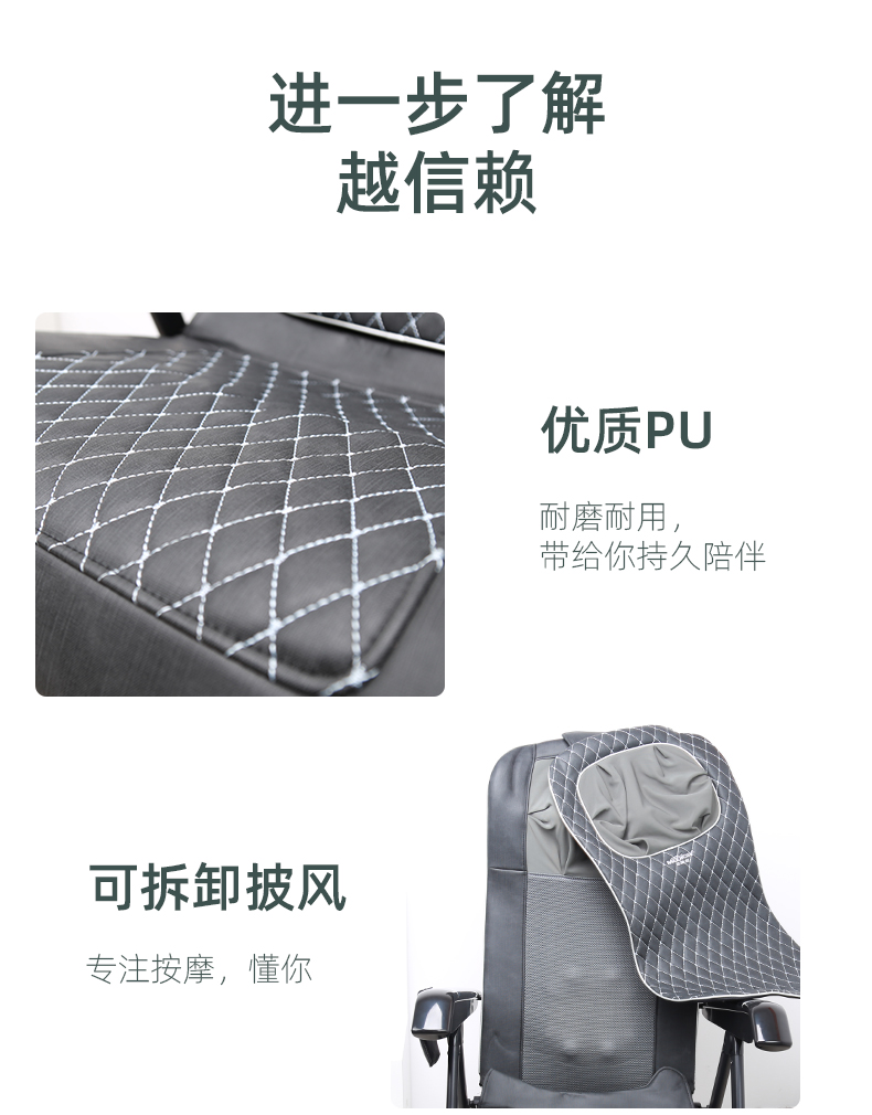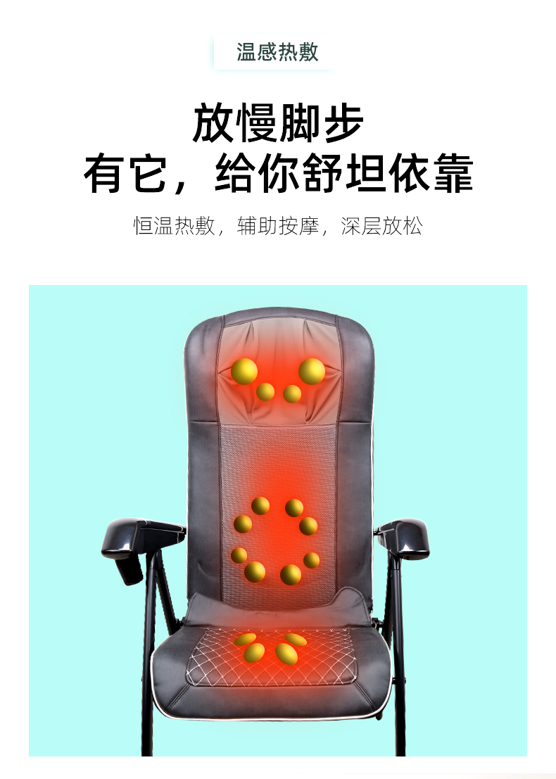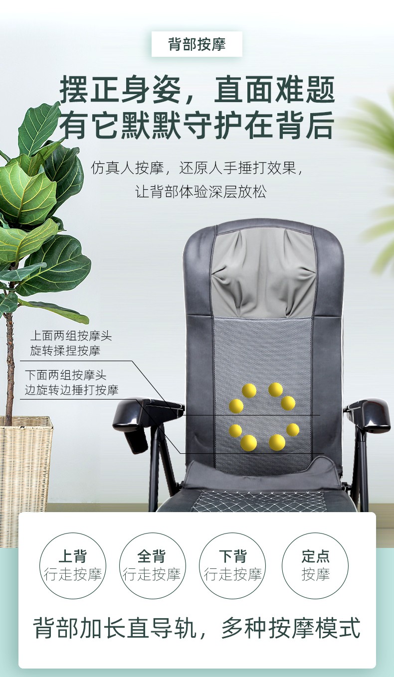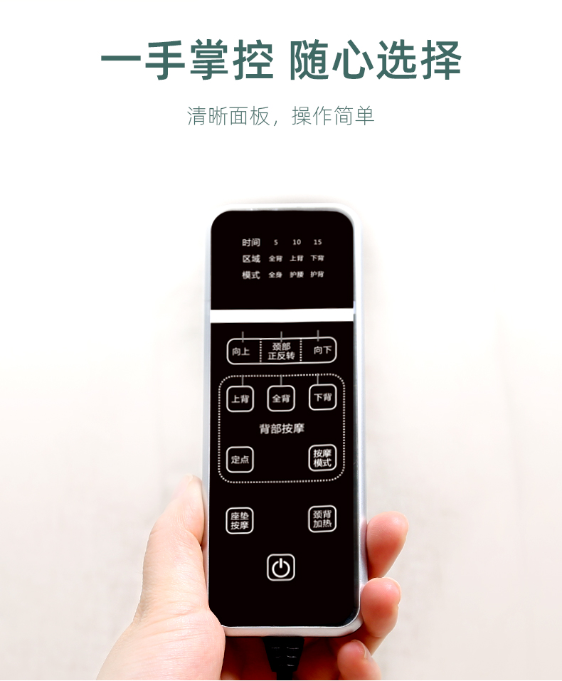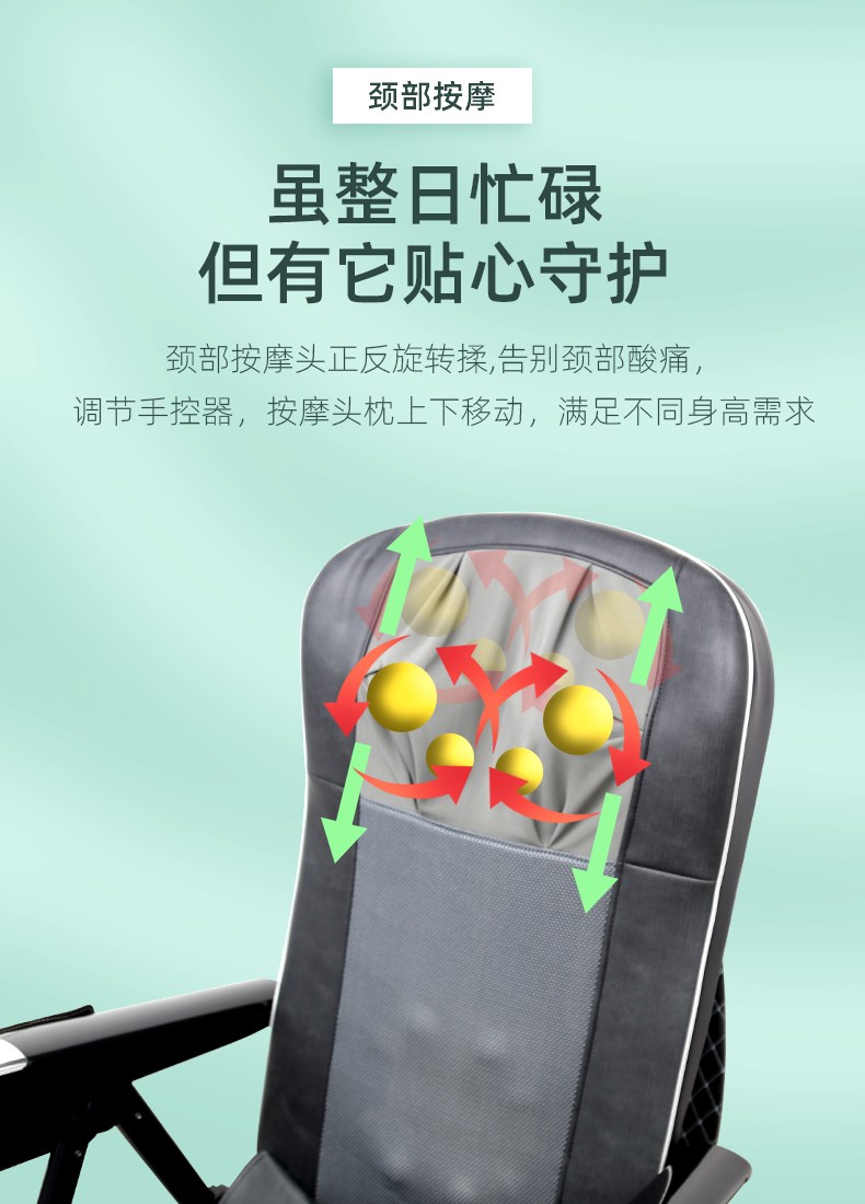 1.頸部:創(chuàng)新壓肩按摩,正反轉(zhuǎn)揉捏,上下可調(diào)節(jié)高矮適應(yīng)不同人。
