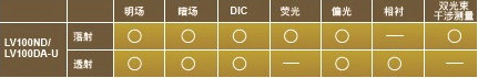 可支持多種觀察方法:明場、暗場、偏光、微分干涉、落射熒光和雙光束干涉測量觀察功能。此外,LV100DA和LV100DA-U還可提供透射型微分干涉、暗場、偏光和相襯觀察功能。