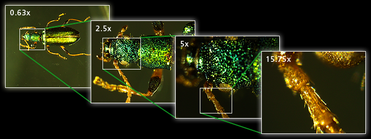 自動對接變倍(Auto Link Zoom, ALZ)功能可在切換物鏡后使視野保持一致。此功能可在進行完整個體拍攝時從宏觀到微觀提供平滑的放大,即您在切換物鏡后系統(tǒng)自動調(diào)整放大倍數(shù)使您看到的圖像與之前一致。