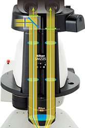 SMZ25/SMZ18為采用復(fù)眼熒光照明附件的體式顯微鏡。這一創(chuàng)新設(shè)計確保了在低倍率下明亮與均勻的照明,獲得無與倫比的均一明亮的大視野熒光圖像。